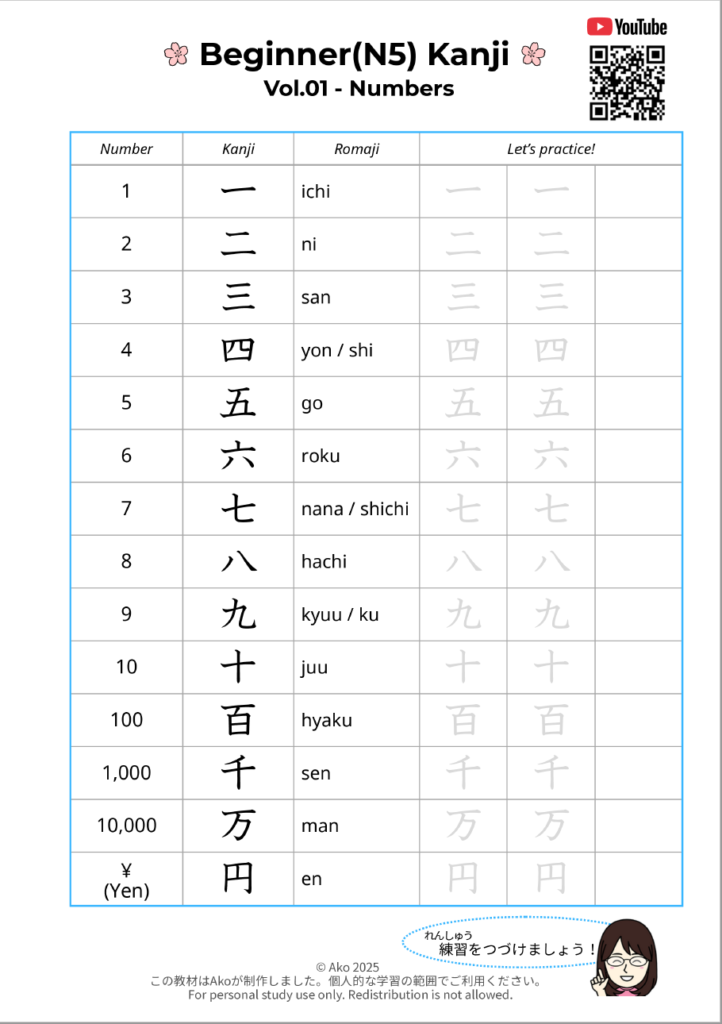 I’ve prepared a PDF Kanji list for your review! It includes the 14 Kanji we studied today and also some space for writing practice. It’s free to download! 🎁